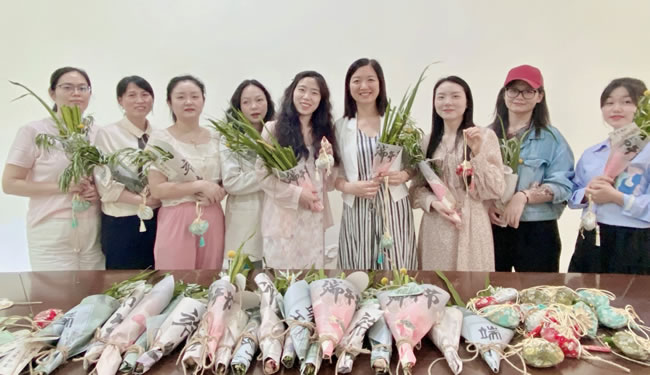 活動還組織了DIY艾草花束。裁剪艾草菖蒲、搭配黃金球、加上精美的包裝紙,配上節(jié)日專用小卡片、艾草香囊,簡潔卻寄托了美好祝愿的一束束精美的艾草花束也在女生的巧手下誕生。